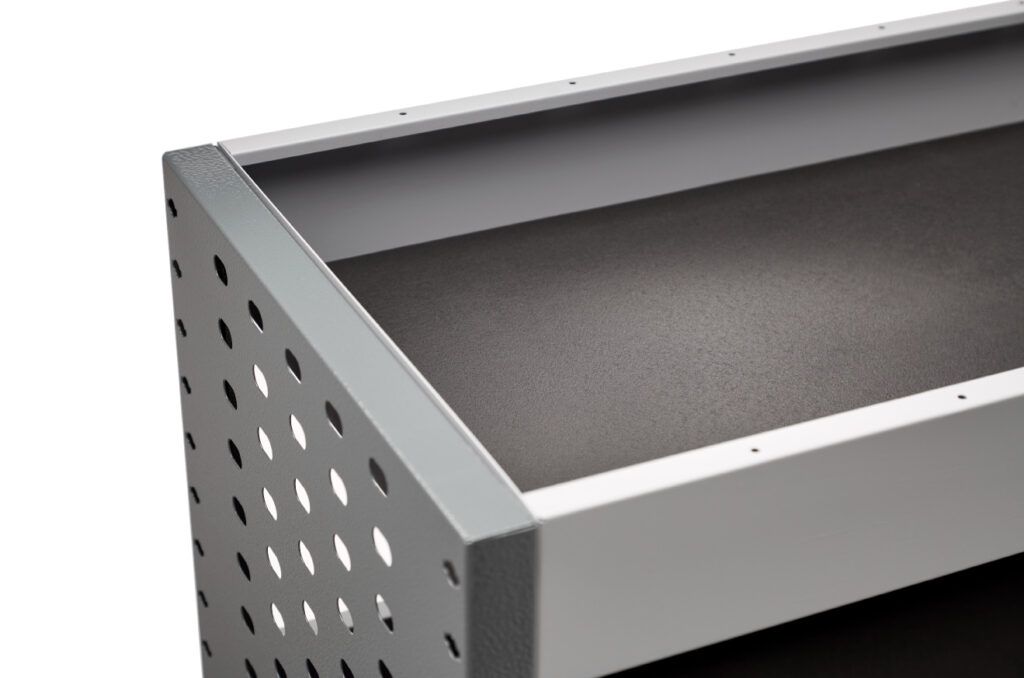 Robustní gumové podložky na dno polic, které zajišťují přilnavost nářadí, zabraňují jeho pohybu během přepravy a snižují hluk vibrací od vybavení.
