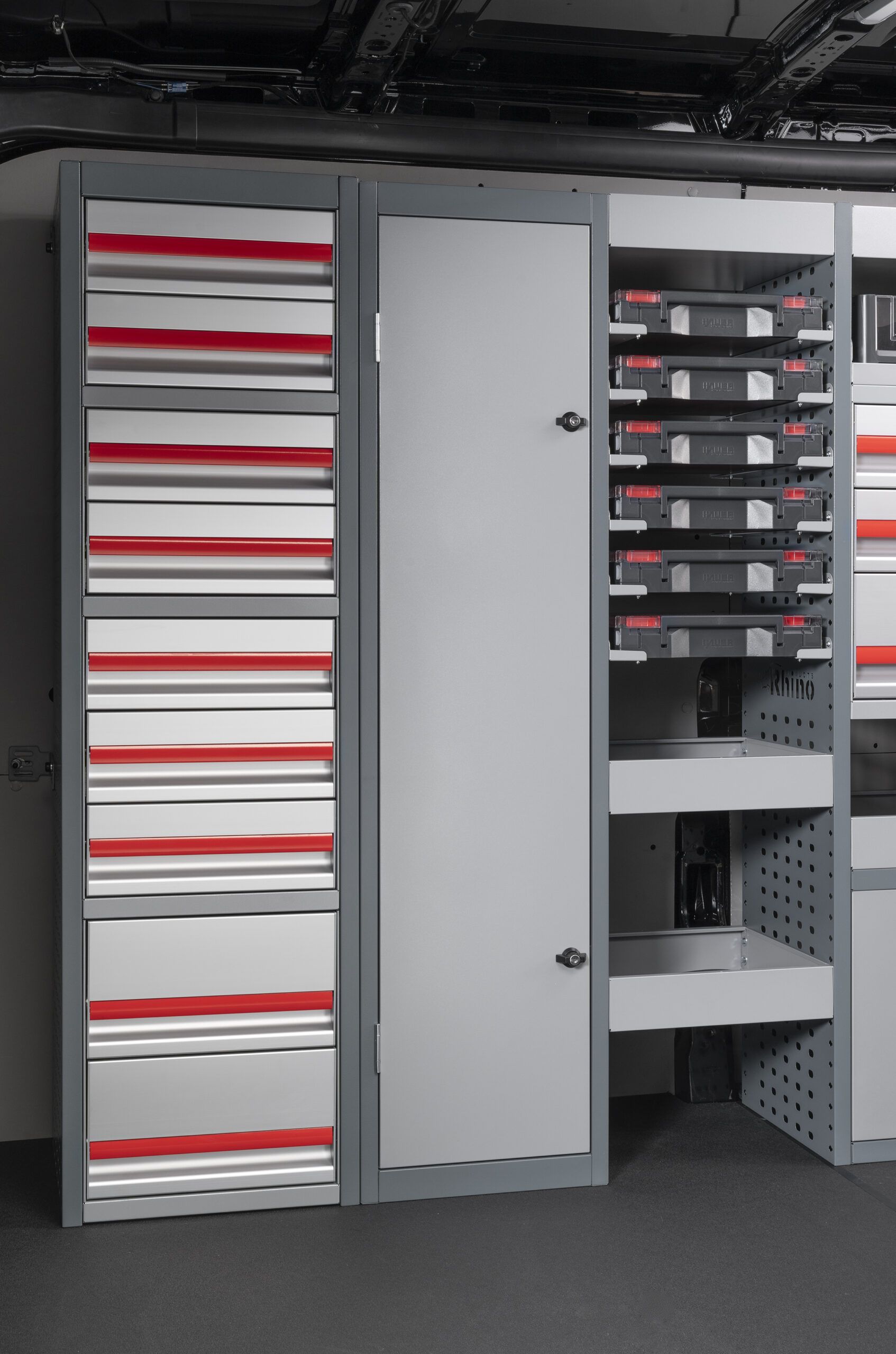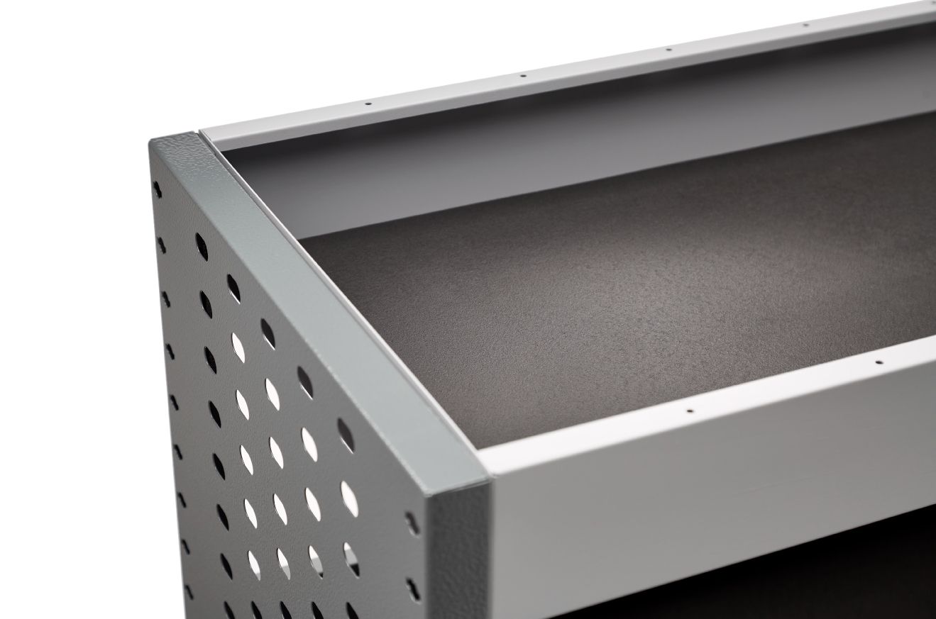 Celoplošné, samostatně stojící skříňky se zámkem, vyrobené z pevné oceli, které zabraňují pohybu větších předmětů během přepravy. Menší skříňky lze umístit do polic podle zvolené konfigurace.