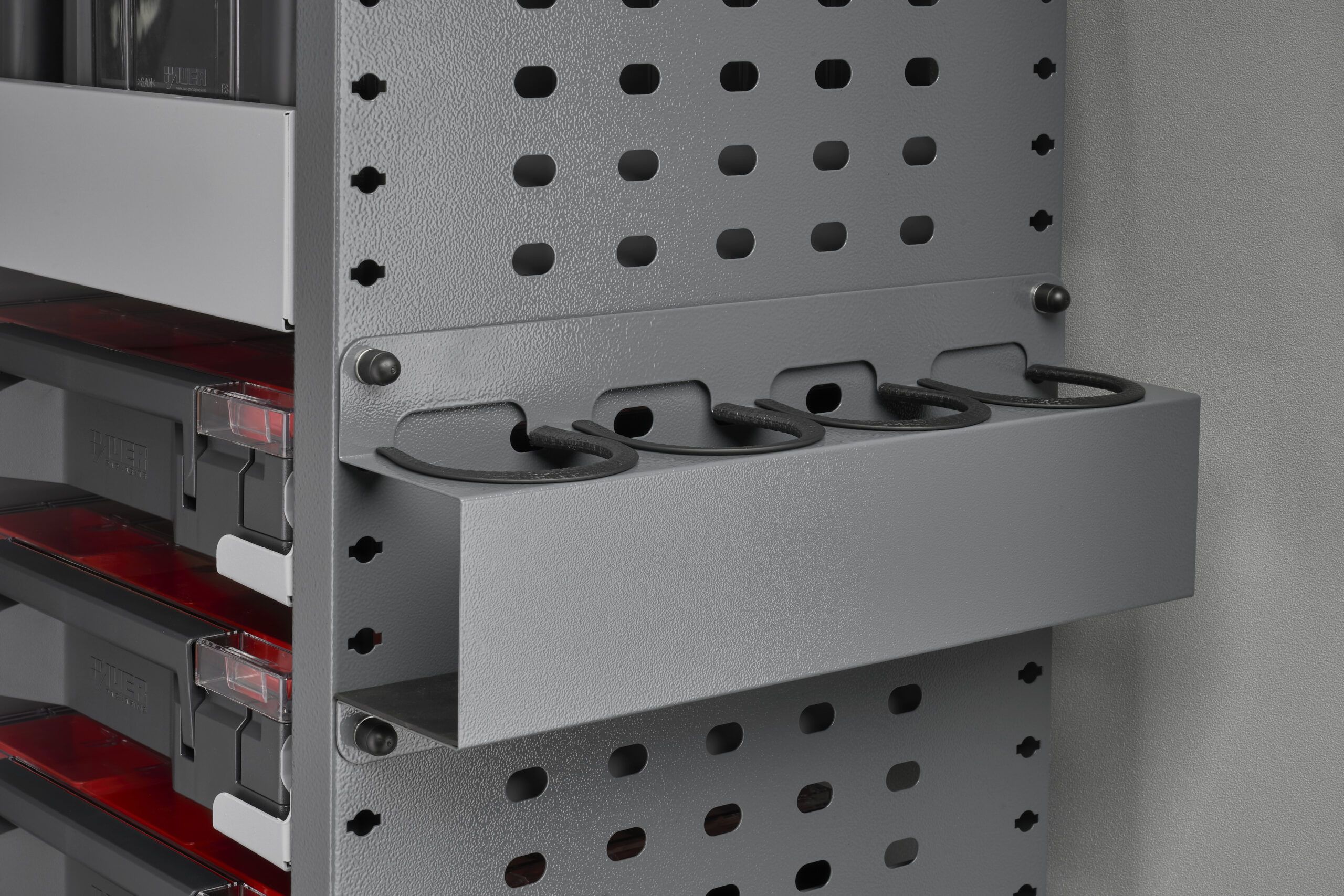 Lze je snadno kombinovat se zásuvkami, policemi i skříňkami. Každý box má držák, který se upevňuje pod polici, takže drobný materiál zůstává na svém místě i při jízdě.