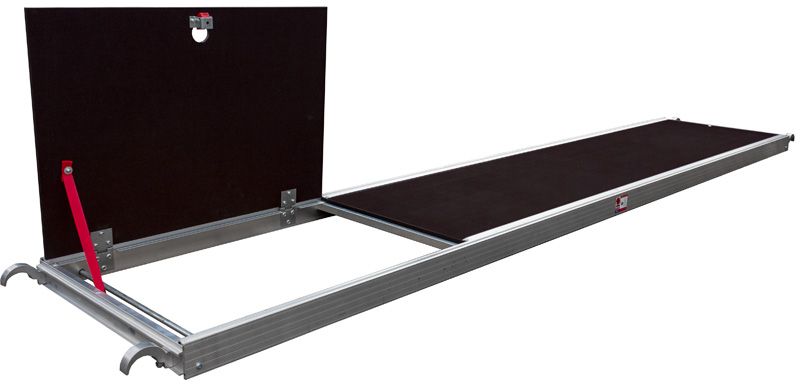 Tato podlážka JUMBO s průlezem je navržena tak, aby nabízela odolnost a funkčnost na staveništi. Podlážka je vyrobena z voděodolné a protiskluzové finské překližky z čisté břízy, což zajišťuje pevnou a bezpečnou plochu. Je osazena v pevných hliníkových bočnicích, které dodávají extra pevnost a stabilitu. Háky na podlážce jsou přesazené, což umožňuje podélné prodloužení lešení bez vyosení. Na spodní straně podlážky se nachází patentovaná pojistka proti větru, která podlážku zajišťuje a je kompatibilní se všemi typy lešení, díky čemuž je vysoce univerzální.